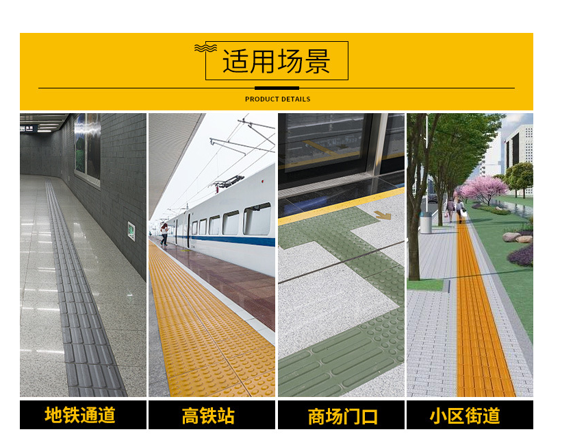 盲道磚用途:黃色盲道磚用于高鐵站、市政道路人行道、殘聯